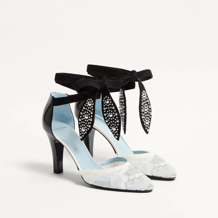 Valentino Garavani Foliefoliage高跟鞋由新任创意总监Alessandro Michele打造,凸纹蕾丝鞋面与 8.5cm漆皮高跟营造出丰富的材质对比,绒面革踝带饰以金属钉扣,平添一抹现代气息。不妨将踝带系成醒目的结饰,巧妙展现别致细节与穿搭巧思。