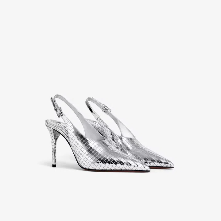 来自Alaia的Art Deco高跟鞋采用闪亮镜面皮革精心打造,在灯光映照下宛如迪斯科球般璀璨耀眼。尖头设计利落有型,9 cm高跟更显秀场腿部,露跟后袢设计则兼顾舒适与稳固,令步履充满自信风采。