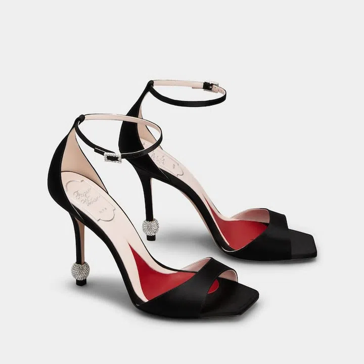 黑色高跟鞋是晚宴造型的必备单品。这款Roger Vivier Jewel Heel凉鞋采用丝缎材质打造,10cm镀漆后跟饰以璀璨镶钻圆球,精致夺目。踝部配有扣带设计,整体整体造型典雅迷人,轻松点亮晚宴衣装。