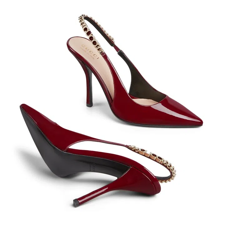 Gucci Signoria 系列露跟浅口高跟鞋以品牌发源地著名的佛罗伦萨市政广场为名,焕新演绎经典雅致格调。鞋款融合亮泽漆皮与利落尖头设计,搭配标志性Gucci链条装饰,为造型注入一抹时尚摩登之美。