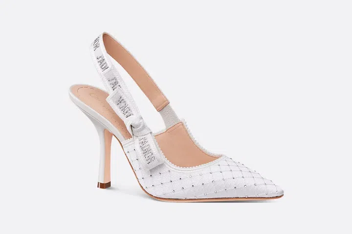 这款Dior J’Adior露跟高跟鞋是品牌典范之作,采用白色棉质刺绣面料匠心打造,饰以银色调仿水晶,彰显时尚魅力与艺术感。鞋身配有标志性的J’Adior仿水晶饰带与蝴蝶结装饰,是兼具精致感与现代气息的理想晚宴之选。