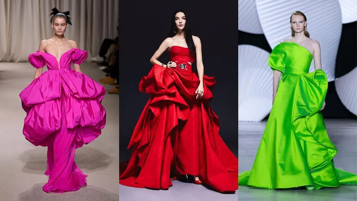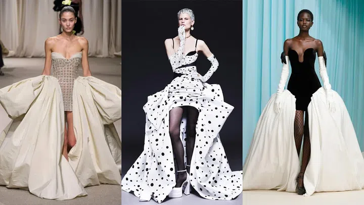 份量感可通过厚重或丰富的面料、层叠设计或大胆剪裁实现,使服装更加立体、多姿多彩;而戏剧性裙摆则通过大量面料、复杂褶皱或夸张长度呈现,增加视觉冲击力和戏剧效果,给人留下印象深刻的视觉效果,让您成为全场的焦点。