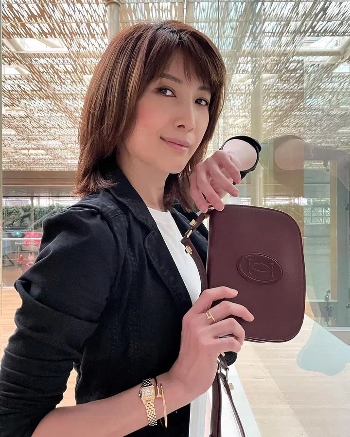 Cartier 的Must系列狩猎包在1973年问世,一推出便获得热烈反响,品牌从此开始以酒红色为其标志性的颜色,并成功树立独特的皮具美学风格。欧萱手中的Saddle款式以光滑皮革制成,装饰着超大号品牌标志——浮雕花纹和马鞍缝线的圆形饰牌充分展现品牌的工艺美感。