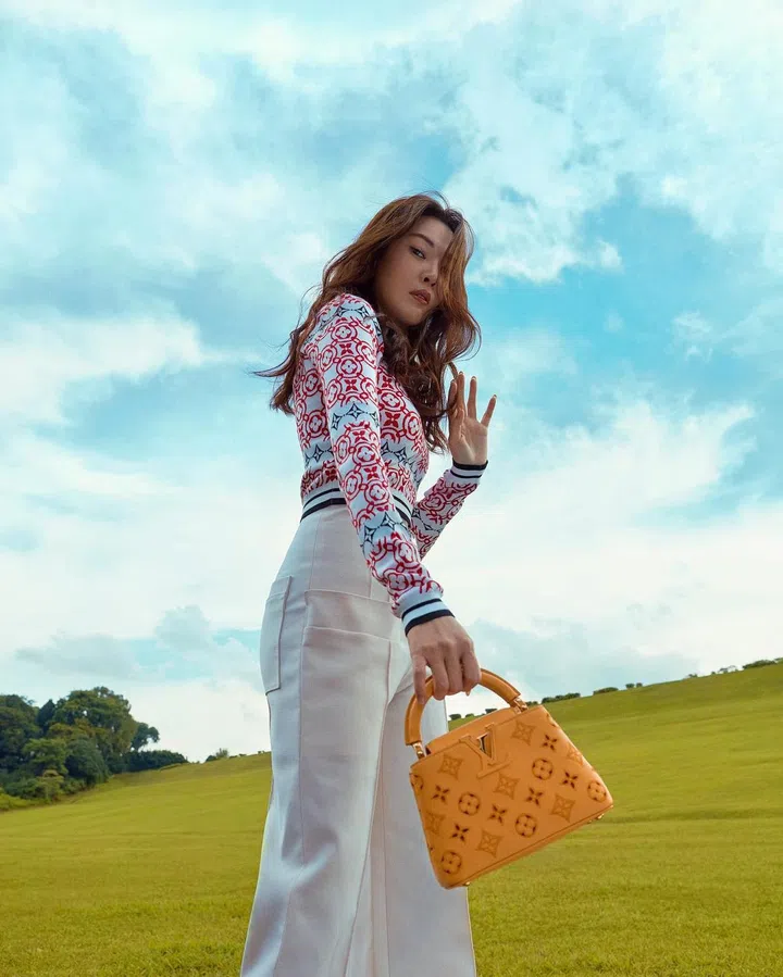 来自Louis Vuitton的Capucines手袋是女性魅力的恒久象征,代表品牌神髓,灵动融合优雅气质、实用性和精湛工艺。Jesseca手中的Cacupines手袋出自品牌的2023早秋系列,包身缀有Monogram通花图案,镂空设计巧妙地以布尔登缝线点缀,缔造柔美的孔眼刺绣效果。