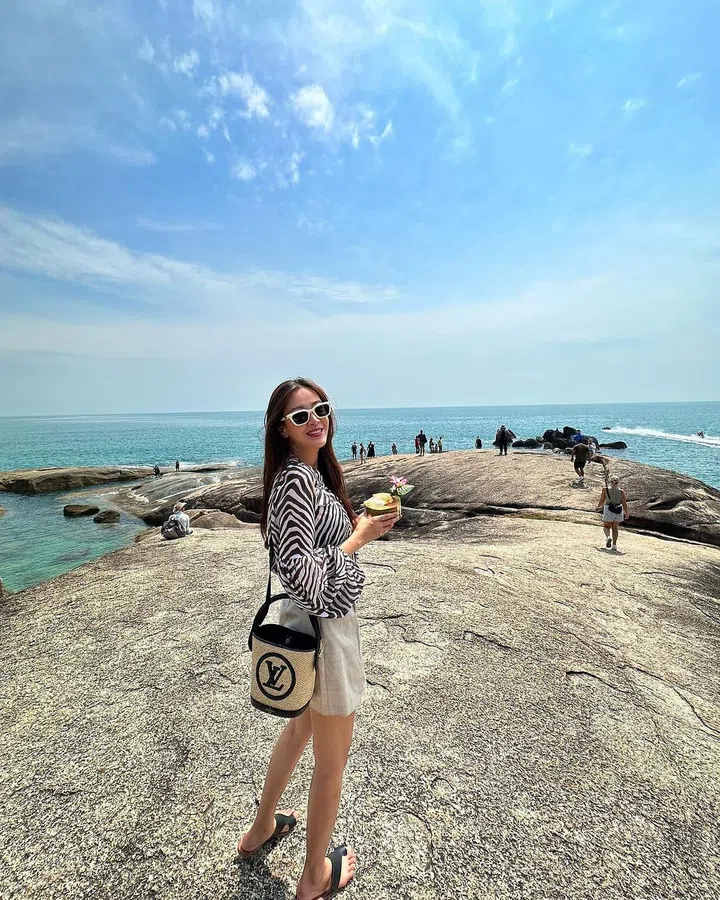 出国度假少不了一款经典的草编包,刘子绚背着Louis Vuitton Petit Bucket手袋如春风般清新,采用酒椰叶纤维编织而成,饰以优雅的皮革细节,可容纳日常必需品。