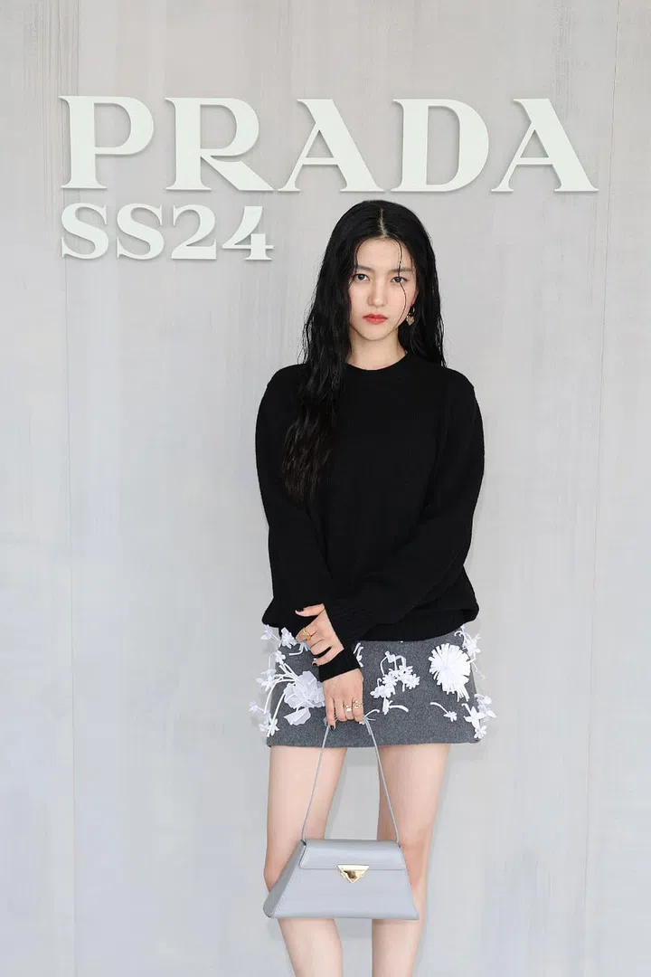 Prada代言人金泰梨以深色长袖上衣搭配浅色印花短裙亮相,形成鲜明对比,展现出优雅且清新的风格。