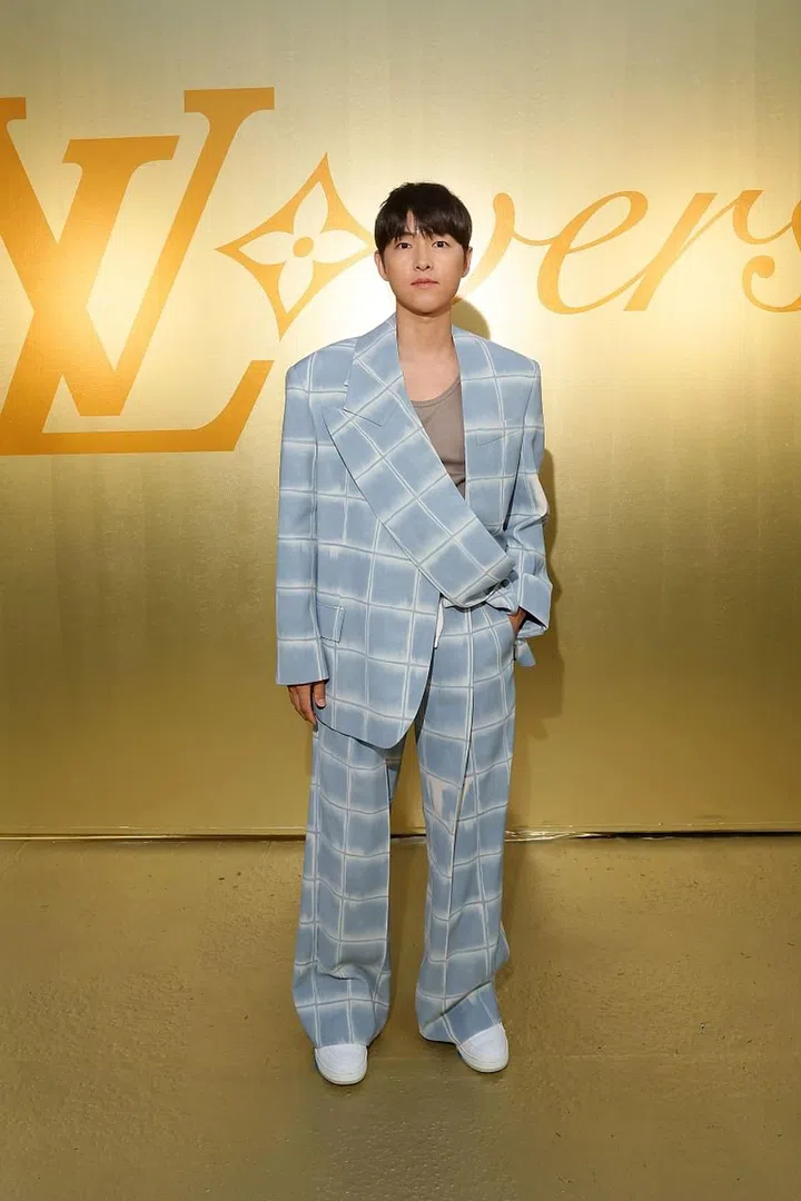 不久前成为Louis Vuitton全球品牌大使的宋仲基,身穿着水蓝色印花套装,宽松的剪裁尽显独特率性。