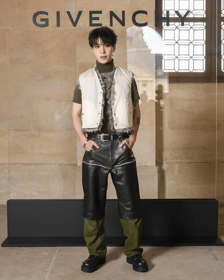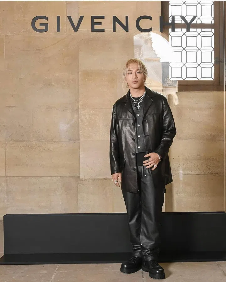 韩国男团Big Bang团员Taeyang以一袭all-black造型现身Givenchy大秀,黑色皮革外套搭配皮裤,展现时髦且放荡不羁的酷帅态度。
