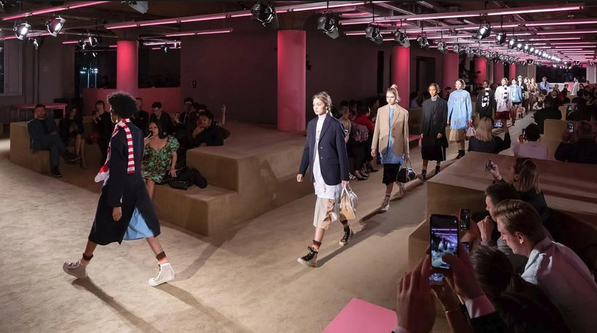 从2007年春夏系列开始,Prada就与建筑师事务所OMA和旗下设计机构AMO保持着紧密的合作关系。来到2020早春系列,AMO将Prada美国总部大楼——纽约钢琴厂重新打造成一处适合社交聚会的亲密环境,举行品牌发布会。由Herzog & de Meuron设计,这颇具质感的内部结构,与建筑自身的工业化特征形成对比,空间内的咖啡桌和柱子均饰以闪亮的粉色涂层,让人置身于春天的奇幻梦境。