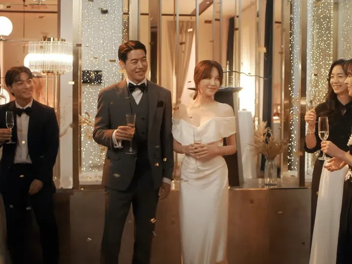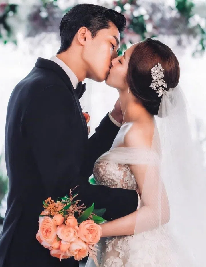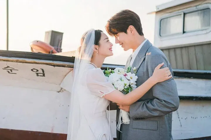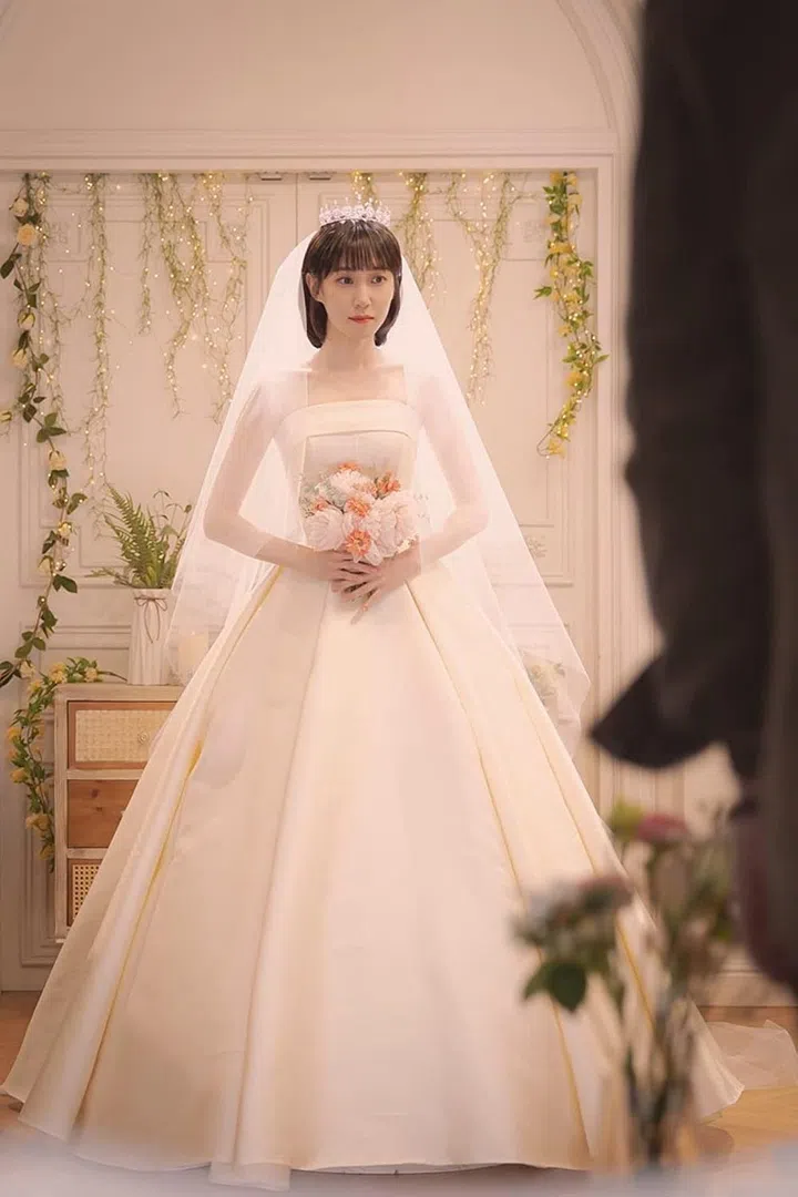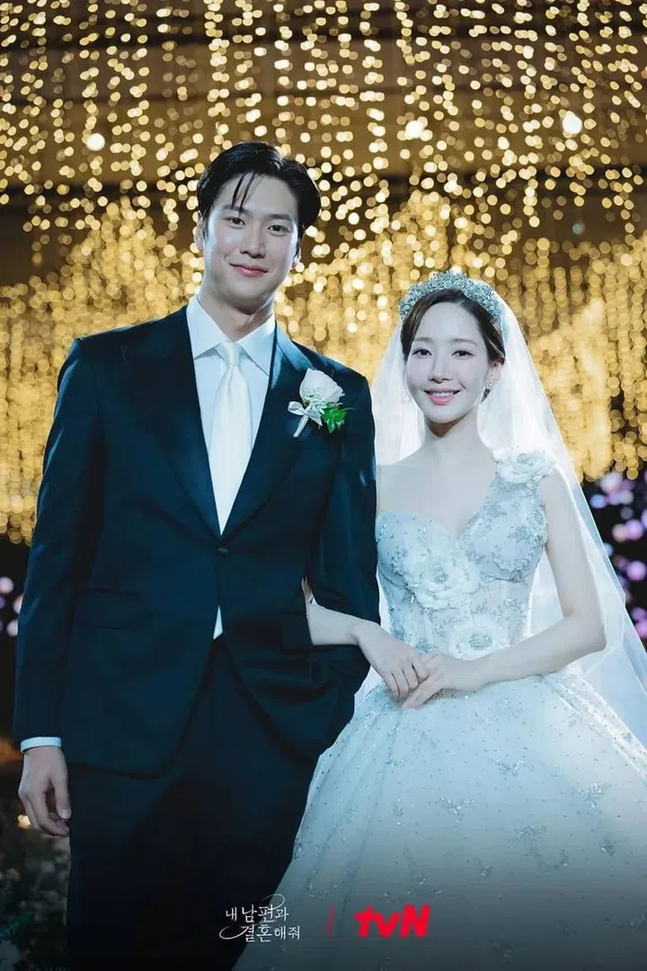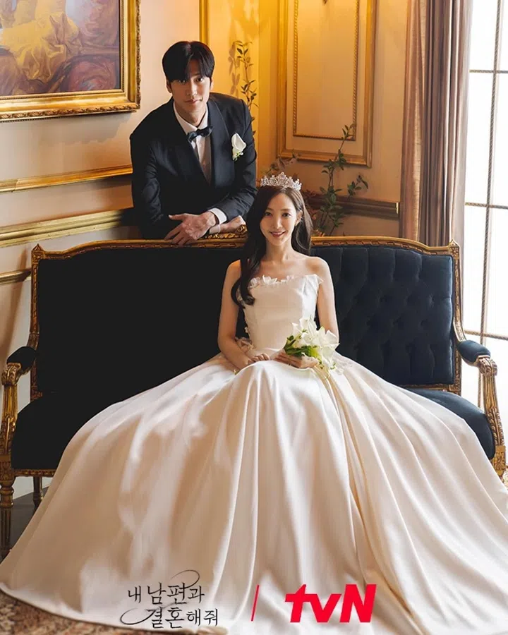 37岁“收视女王”朴敏英(Park Min-young)和29岁罗人友(Na In-woo)首次搭档的复仇韩剧《和我老公结婚吧》(Marry My Husband)屡创收视佳绩。她在剧中成功改写悲惨结局,在大结局播出后,TvN也释出男女主角的绝美婚纱照。只见朴敏英身穿白色缎面平口婚纱,搭配皇冠头饰,散发公主的优雅气场。