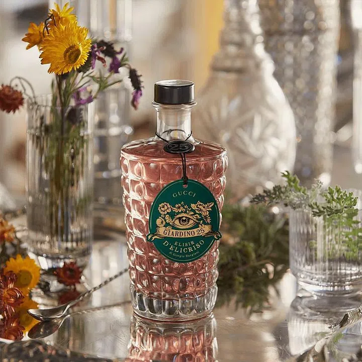 Gucci推出品牌首款鸡尾酒——Elisir d'Elicriso,由伦敦传奇酒吧Connaught Bar的首席调酒师Giorgio Bargiani专为佛罗伦萨的Gucci Giardino 25咖啡馆和鸡尾酒吧研发。调酒师 Giorgio Bargiani花了近七个月的时间尝试了15种调酒配方,才让这款鸡尾酒带有意大利花园的草本香气。 Elisir d’Elicriso鸡尾酒以苦艾酒、柑橘和草本香调为基底,再搭配香根草、利口酒提味,最后以干杜松子酒、白醋、来自义大利五大酒庄之一的圣葛维多酒庄(Tenuta San Guido)的红葡萄酒以及蜡菊香精油收尾。调酒师也建议用四种方式品尝这款鸡尾酒,例如加入冰块、少许气泡酒、苏打水或奎宁水。