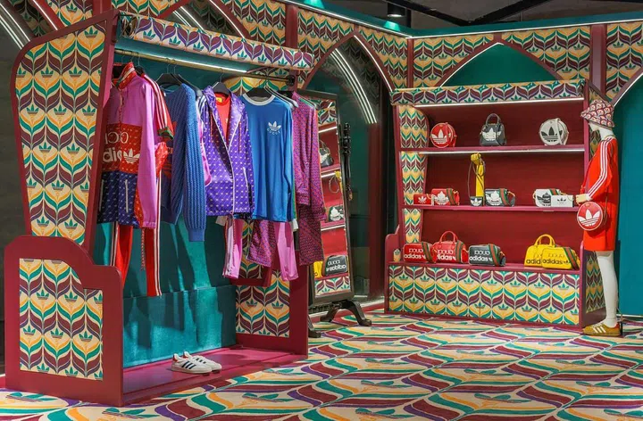 Adidas X Gucci 跨界联名系列取材自80和90年代风格, Gucci 创意总监 Alessandro Michele 运用标志性剪裁与两大品牌的创意组合元素,创造出既怀旧又富当代气息的时髦单品。系列中包含成衣、包袋、小皮具、鞋履和配件等丰富单品,并以红、黑、白、棕等配色为基调。Gucci也从6月7日至6月27日在新加坡Design Orchard设立限时快闪店。