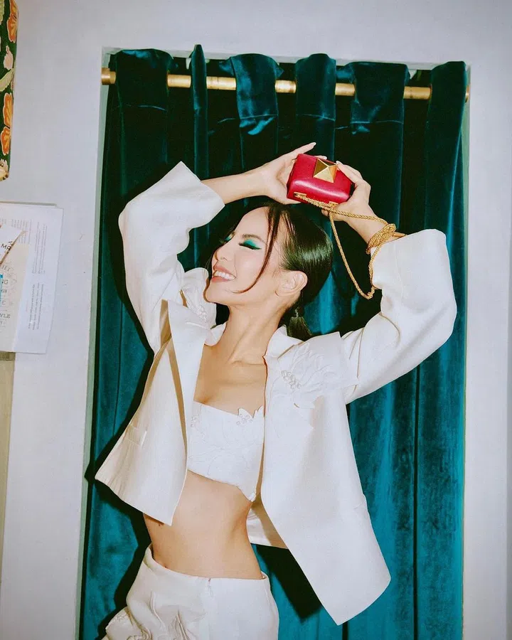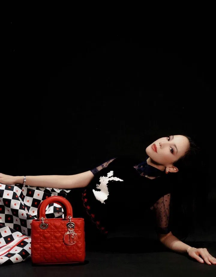 这款Lady Dior My ABCDior 手袋来自2021年的Dioramour七夕限定系列,采用鲜红色羊皮革精心制作,以心形图案藤格纹缉面线打造醒目的绗缝细节,珐琅“D.I.O.R.”吊饰与心形吊饰也以新姿态登场。这款包包更衬托出谢宛谕的迷人气场。
