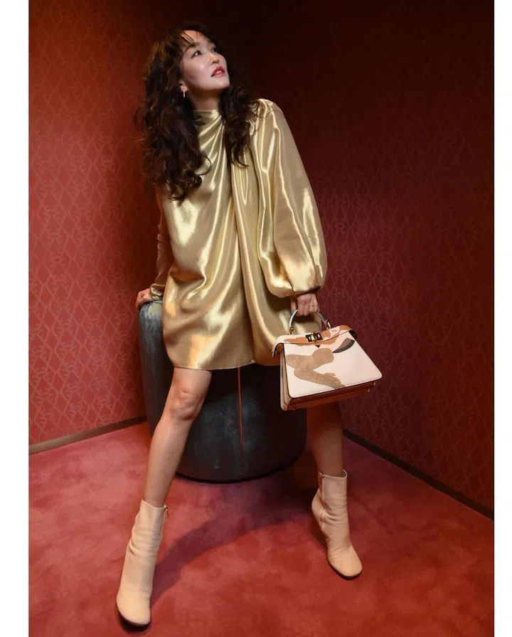 阿姐郑惠玉这一袭优雅飘逸的白色洋装出自Fendi 2021秋冬系列,是Kim Jones上任以来设计的第一个成衣系列。她手中提着秋冬主打的Peekaboo ISeeU Stretch 手袋,经典梯形包身延伸为East-West包型,可以作为手拎包或者手拿包,让整体造型看起来优雅动人。