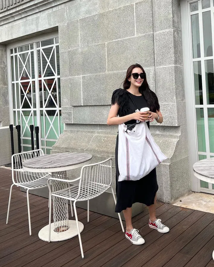 女生也能背男款包包!洪凌斜背的CITY KEEPALL 手袋由Louis Vuitton男装艺术总监 Virgil Abloh 重新设计经典路易威登手袋——1930 年问世的 Keepall 旅行袋。包身由黑色粒面皮革制成,细节设计则以黑白 Damier Distorted 帆布打造,展现非凡潇洒气质。