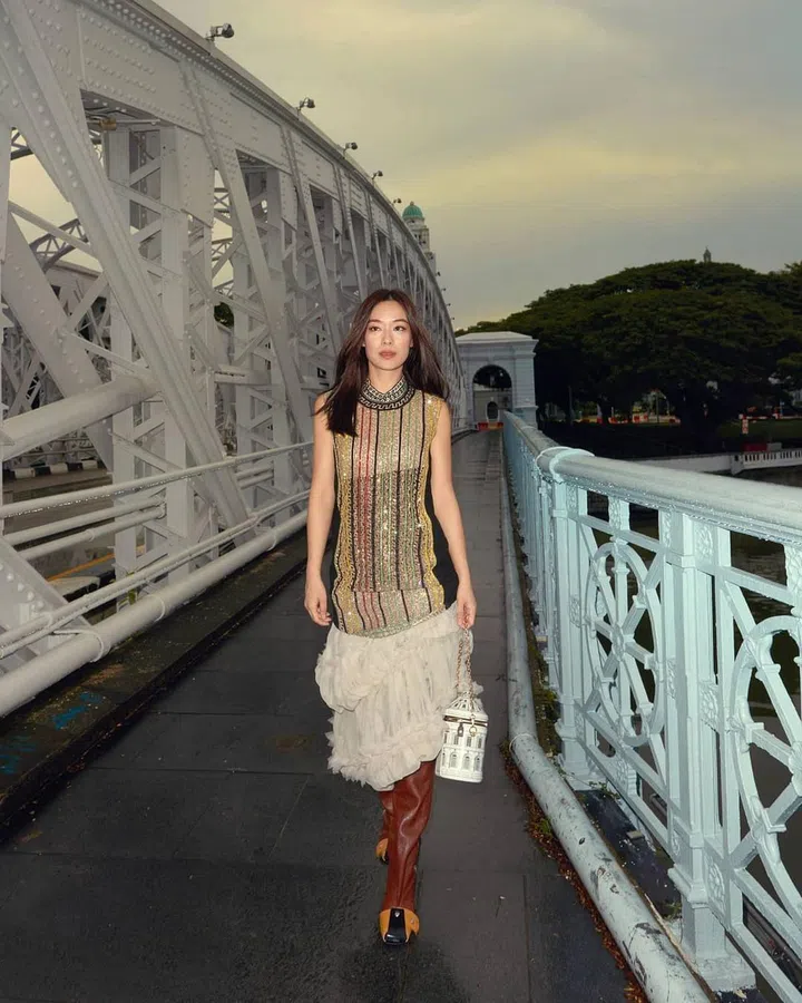 演员林慧玲身着一袭华丽复古的Louis Vuitton 2021秋冬系列造型,闪闪发光的亮片无袖上衣配上垂坠半身裙,脚踩时髦皮靴,手提 Louis Vuitton X Fornasetti Cannes手提袋,为美丽的旁晚增添一抹光彩。