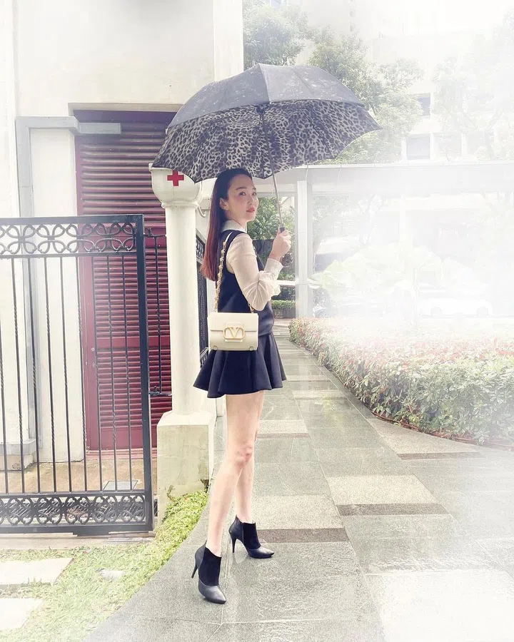 下雨天也不影响时髦穿搭,阿姐范文芳以一袭Valentino 2021秋冬系列黑白黑裙装,搭配品牌最新款Stud Sign 手袋,在雨中演绎浪漫与优雅。