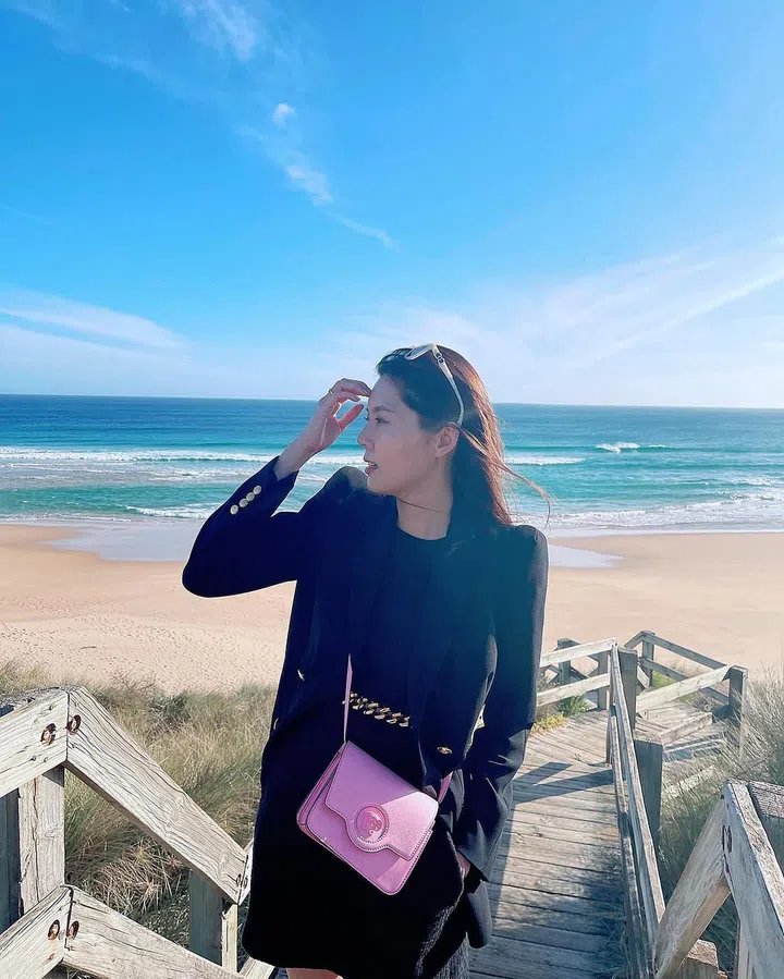 在澳洲旅行的黄思恬,斜背Versace La Medusa 粉色单肩包,饰有同色系美杜莎板饰,方形的包身彰显现代风格,搭配各种服装都很亮丽。