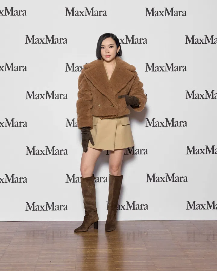 Willabelle以Max Mara焦糖色外套搭配米色短裙与麂皮长靴,整体色调温暖柔和,轻松展现秋冬优雅质感。
