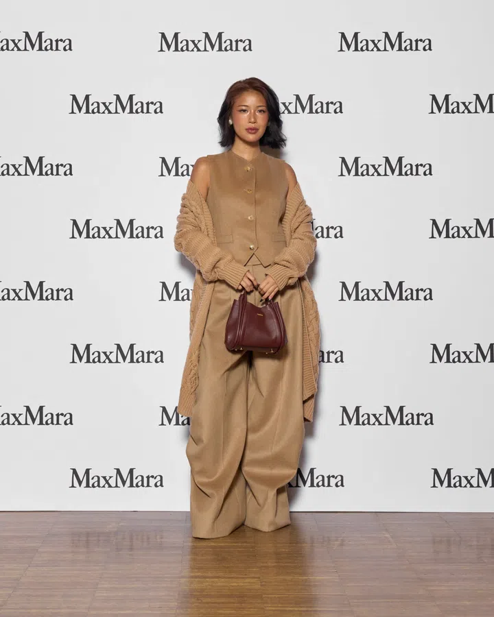 陈一心身穿Max Mara驼色无袖上衣叠搭针织披肩与阔腿裤,整体色调温柔协调,展现舒适优雅的秋冬格调。