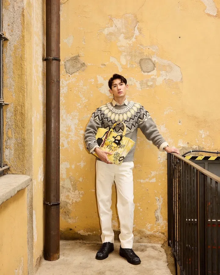 本地演员孙政以一身Onitsuka Tiger造型展现柔和层次感:大地色衬衫外搭粗针织背心,下身配以修身长裤,整体剪裁简洁利落。卷起袖口增添随性气息,搭配撞色系带皮鞋,为造型注入一抹轻盈时尚感。