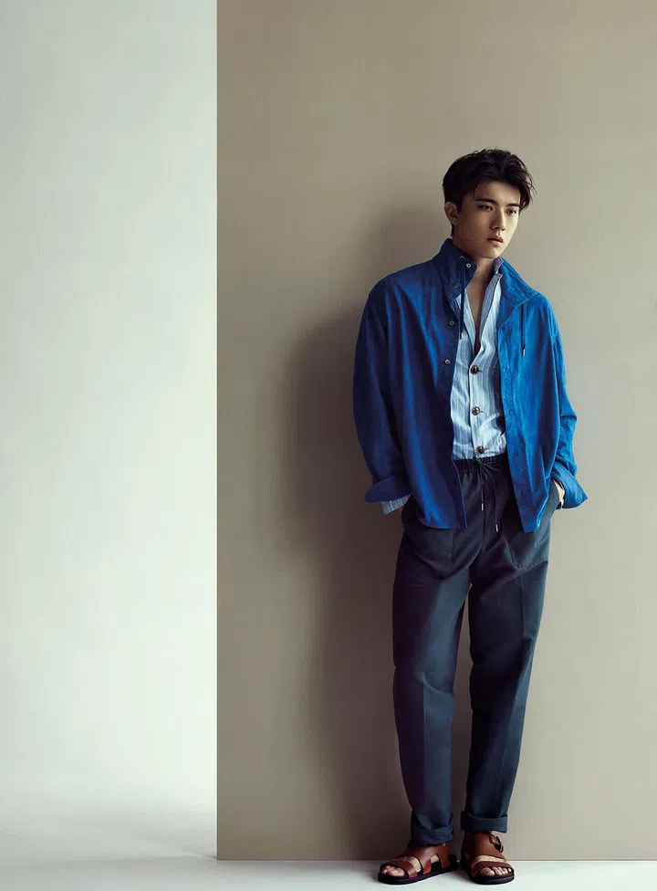 棉质条纹夹克、绒面革飞行员夹克、棉裤和皮革凉鞋/Hermes。