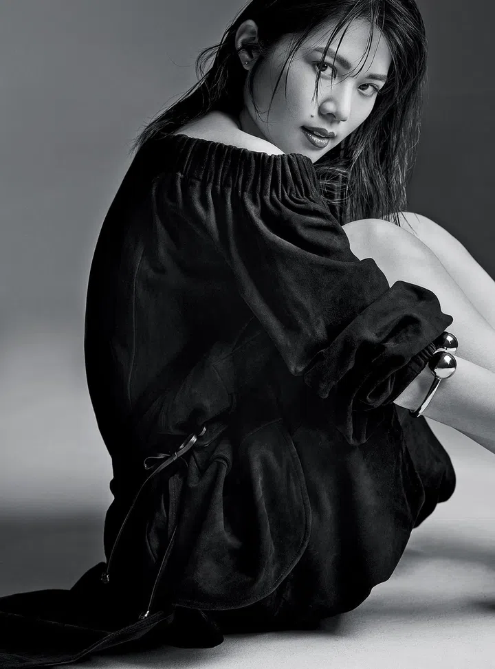麂皮露肩女式衬衫,同款绒面革短裤/Max Mara;金属手镯/Sportsmax。