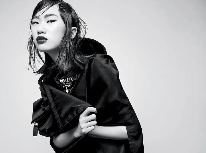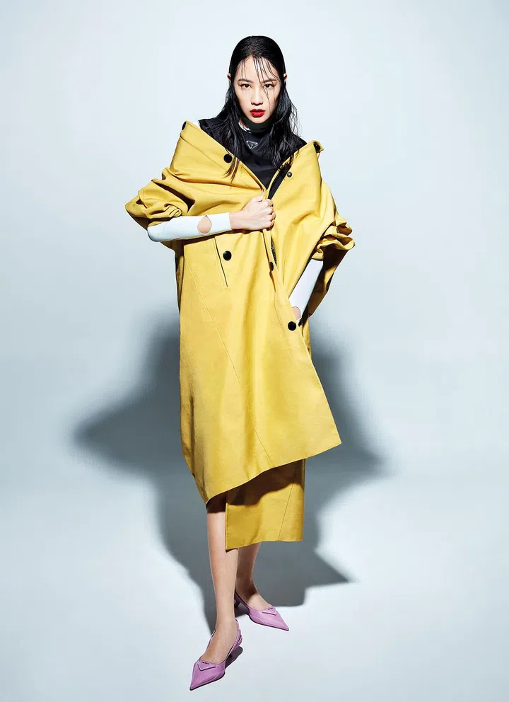 尼龙连衣裙、羊毛针织上衣、尼龙大衣、皮革后跟鞋/Prada。
