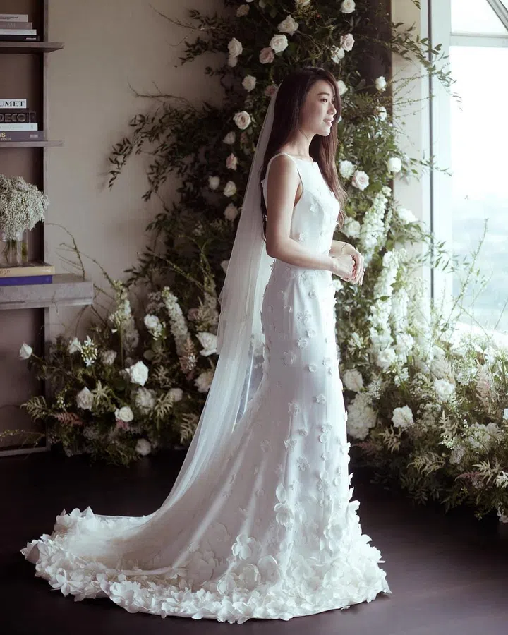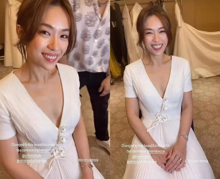 婚礼前的敬茶仪式上,林慧玲选择了Viktor &Rolf的V领口白色礼服,上身剪裁讲究,腰部缀上花朵缀饰细节,以精致的打褶设计营造出飘逸感觉,与其他造型选择的风格一样优雅迷人。