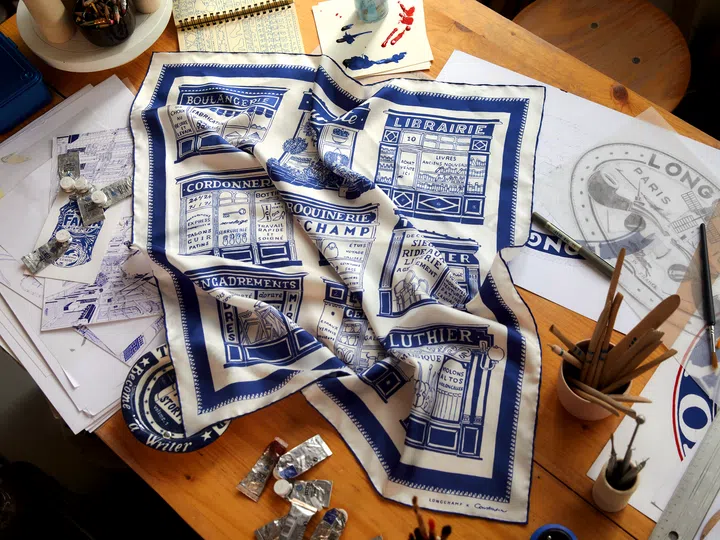 Longchamp x Constantin联名系列丝巾以巴黎街头工匠为灵感,融入Riant标志性的蓝色釉彩线条,描绘从装修工匠到制琴师的城市风貌。