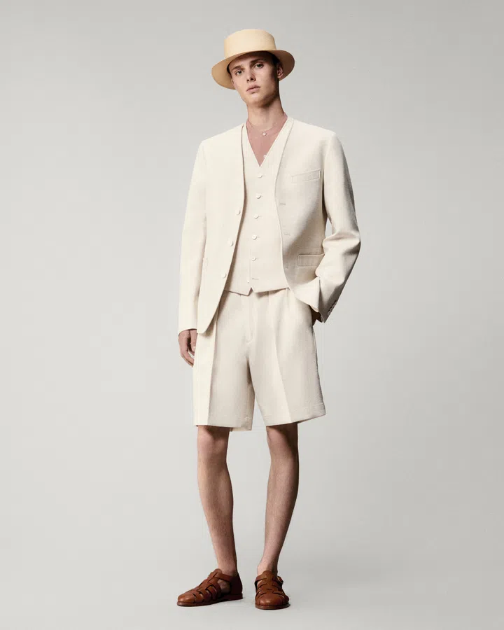 Eduard夹克与Nyūzen短裤以棉麻混纺制成,内搭Elia亚麻衬衫,柔和色彩为整体造型注入一抹温润艺术气息。