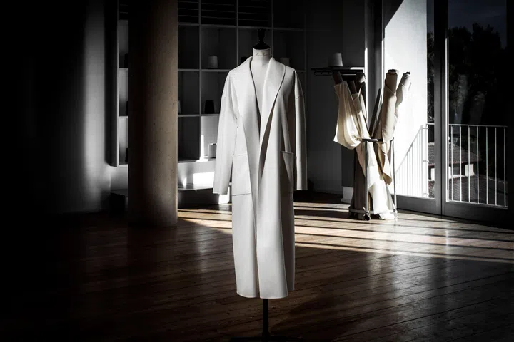 面料则以21旦尼尔的桑蚕丝包覆15微米长纤维的顶级羊绒,形成精妙的双层结构。两种轻薄如蝉翼的材质,在精准结合中达成完美平衡,每米重量仅约350克,却依然保有立体层次与温润触感。织造过程复杂耗时,任何细微偏差,都可能影响成品的柔韧度与光泽表现。关键工序之一Fell stitching是极罕见的古老手工技艺,全程以针线手缝完成,确保服装内外皆呈现平整无瑕的完美收边,每个细节都凝聚着Loro Piana的匠艺精神。