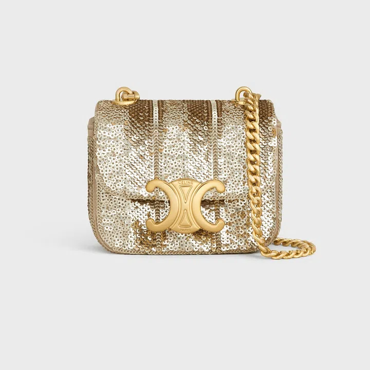 Celine2023秋冬系列Claude迷你包,延用精巧玲珑的小方包轮廓,包身以富丽的金色为基调,通体刺绣深浅金色亮片勾勒出条纹纹理,搭配标志性的金色Triomphe凯旋包扣,以耀眼光芒为年底派对造型增添时尚感。