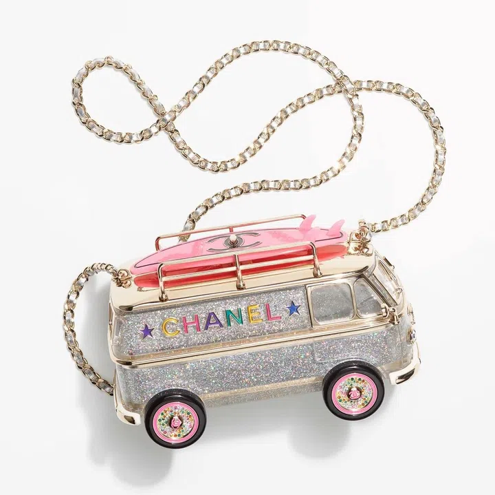 Chanel 2024早春系列最受瞩目的晚宴包之一,以树脂玻璃塑造出迷你面包车造型,采用粉色珐琅涂绘顶部冲浪板和品牌彩色徽标,搭配水钻镶嵌和璀璨亮粉,令人忍不住想去洛杉矶海滩冲浪度假。