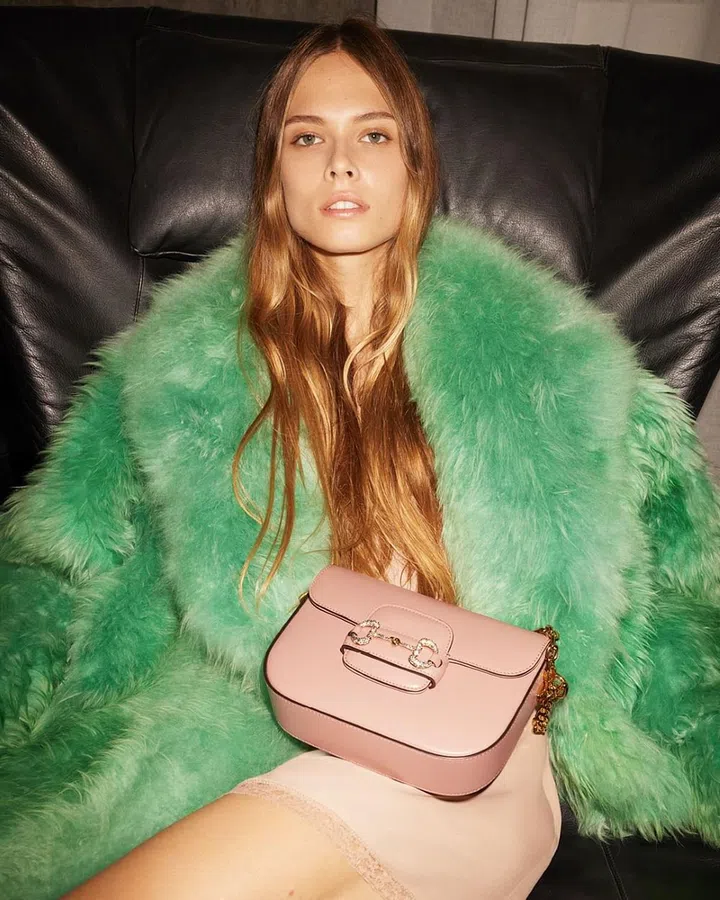 Gucci 2023假日献礼系列新品,以璀璨夺目的水晶马衔扣、虹彩效果绗缝皮革、金属质感皮革为设计亮点。这款Horsebit 1955 系列以经典马衔扣为标志性设计,灵感来自马术运动中的马衔与马镫,采用金属塑造出一条衔链和两侧D型双环,本季铺镶以璀璨仿水晶装饰,为包包注入灵动细节。