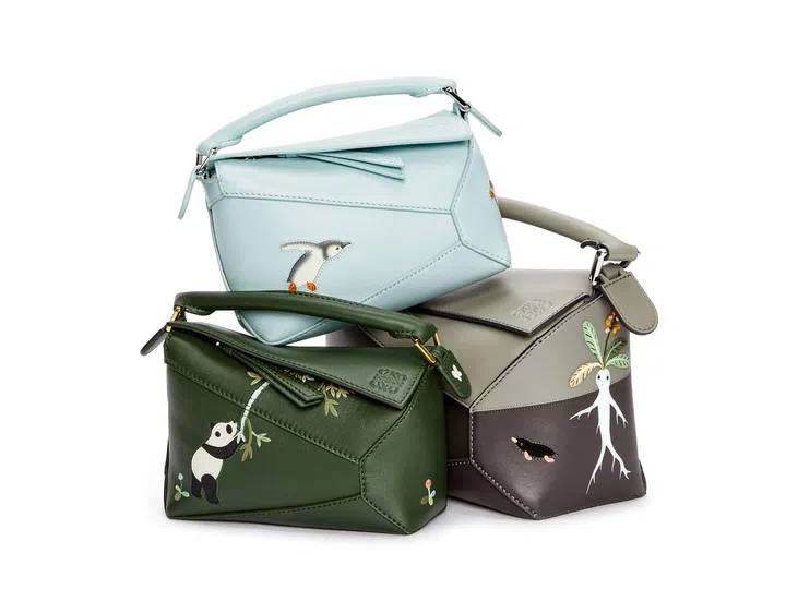 Loewe与京都陶瓷工作室Suna Fujita携手呈现2023节日甄选系列新品,将艺术家笔下的趣味生灵与梦幻景观复现于手袋和配饰作品之上,采用品牌标志性皮革镶嵌工艺塑造出熊猫、狐猴、企鹅、曼德拉草、水獭等惟妙惟肖的动植物形象,用想象力施展童心魔法,呈现于品牌标志性手袋系列,如图中的Loewe Puzzle包包。