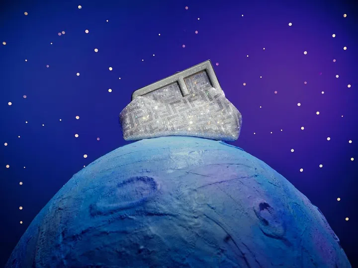 Fendi 2023冬季假日系列新包采用银色和午夜蓝色为基调,以水晶、铆钉、亮片等元素为标志性手袋注入闪耀妆点。这款Fendi First手拿包采用麂皮材质并缀满人造水晶和FF图案钉饰,搭配银色层压皮革饰边和闪粉细节,在灯光下熠熠生辉,非常适合出席圣诞或跨年活动时佩戴。