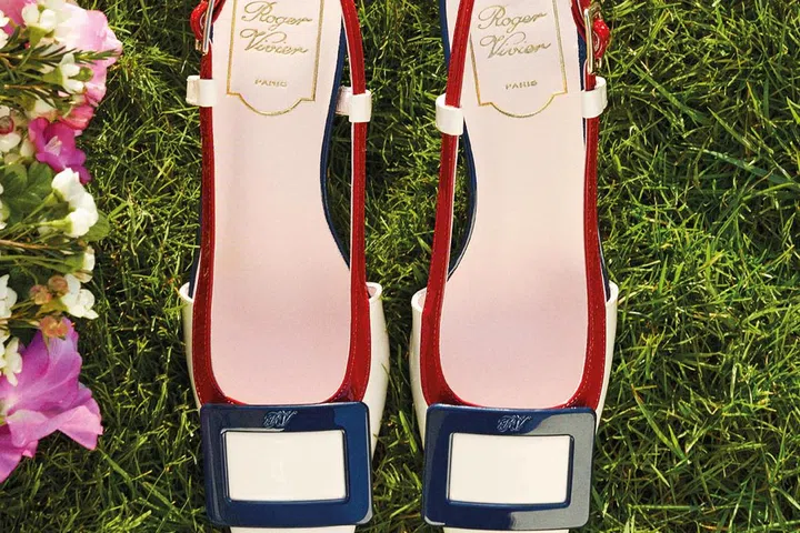 Roger Vivier 2025盛夏系列以红白、 蓝白条纹唤起中世纪海滨 假期的浪漫,被巧妙运用于Belle Vivier Slingback。