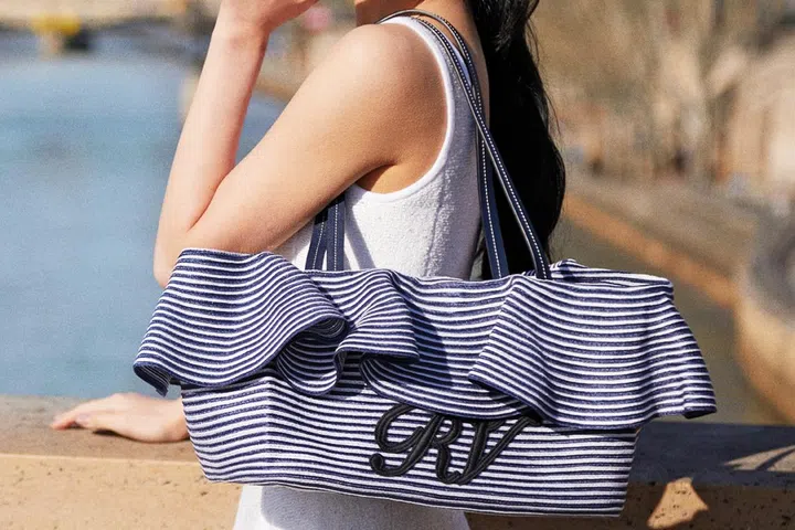 Roger Vivier 2025盛夏系列呈现轻盈奢华的度假风情,包括点缀水晶的坡跟鞋,配有珠宝手柄的柳编包,荷叶边草帽与俏皮渔夫凉鞋。红白、蓝白条纹唤起中世纪海滨假期的浪漫,被巧妙运用于Belle Vivier Slingback鞋履、发饰与夏季托特包上,洋溢法式夏日的俏皮与活力。