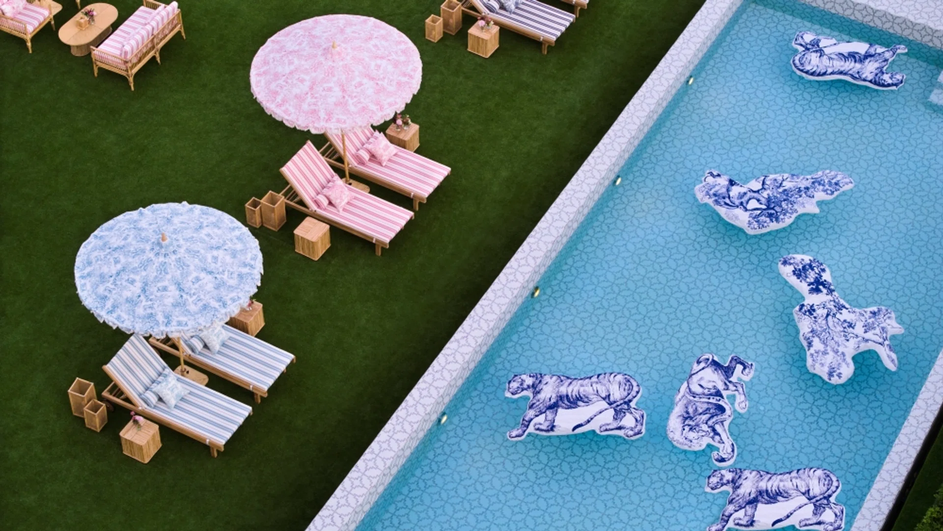 园区采用自然色调装饰,点缀长颈鹿、大象、老虎等等身藤编动物装置,营造梦幻般的热带丛林景致。户外露台设有印花遮阳伞与扶手椅,搭配动物造型浮具,营造轻松俏皮的夏日氛围。现场更设有Dior Café与Café Bike,为阳光假期增添一抹悠然惊喜。