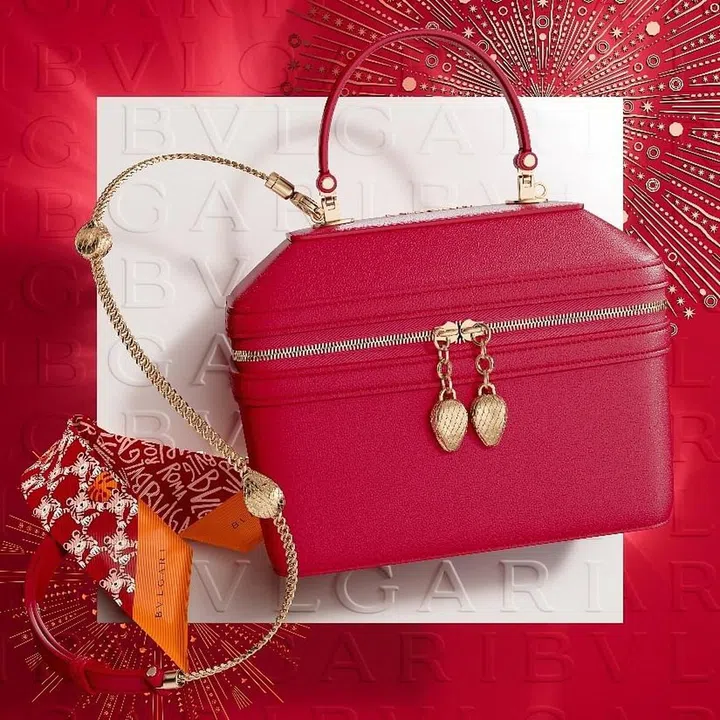 高级珠宝品牌宝格丽(Bvlgari)的虎年限定手袋,以珠宝盒的造型,搭配紫红石榴石红色粒纹小牛皮与金色蛇首拉链袢,充满喜庆的春节氛围。亮点是包包内部盒盖上出现一只俏皮可爱的卡通老虎,如同将新年鸿运藏在宝盒中。