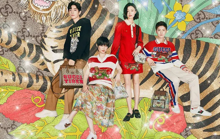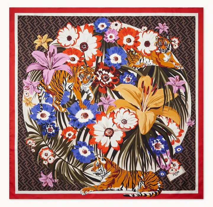 Gucci前两年的春节分别与迪士尼的米奇老鼠、哆啦A梦推出联名款,今年则回到品牌的资料库,找出1960年代插画家Vittorio Accornero de Testa为品牌设计的经典Flora印花图案,结合现任创意总监 Alessandro Michele钟爱的老虎图腾,在繁花青绿之中诗意新生,彰显Gucci世界多元美学。