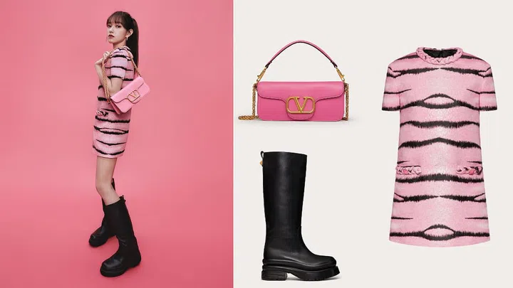 周子琳身着Valentino Tiger 1967中国新年系列中的 印花 Crepe Couture 连衣裙、外搭印花罗缎外套式衬衫 ,手提Roman Stud 中号链式提花肩背包 ,脚上穿着Roman Stud 小牛皮靴子,酷飒中不乏精致浪漫气息。