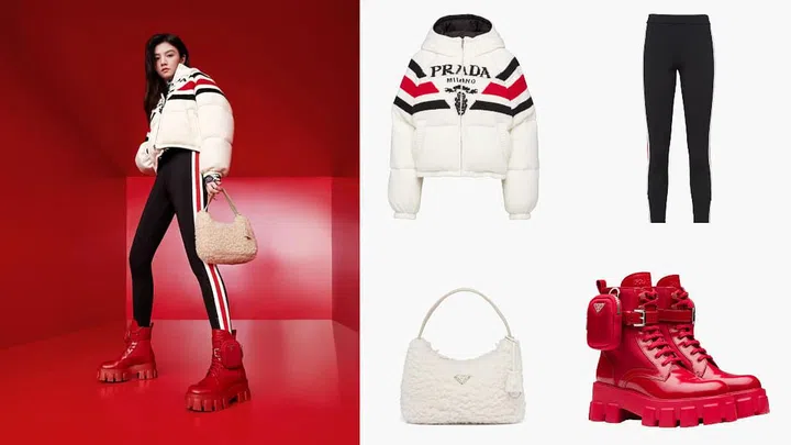 春夏身穿Prada 2022春节系列羊绒羽绒外套搭配双面平纹针织紧身裤,脚踩Monolith 皮革和尼龙中筒靴,手中提着Prada Re-Edition 2000 羊毛和羊绒迷你手袋。