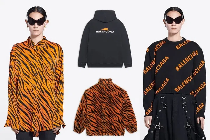 Balenciaga 的2022虎年系列,以吸睛的橘色虎纹为重要印花,呈现在衬衫及夹克、鞋款上,同时也以抽象老虎图案印于连帽衫及帽饰,低调展现时尚虎年元素。