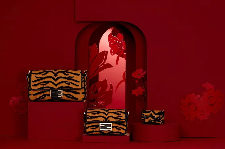 虎纹成为今年新春最时尚的图腾,并且将老虎勇猛无畏的精神与朝气带到穿戴者身上。橘、黑配色虎纹印花是主要表现元素,呈现于的各种款式尺寸的Fendi Baguette包上。