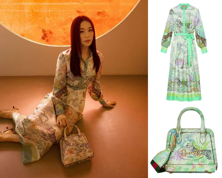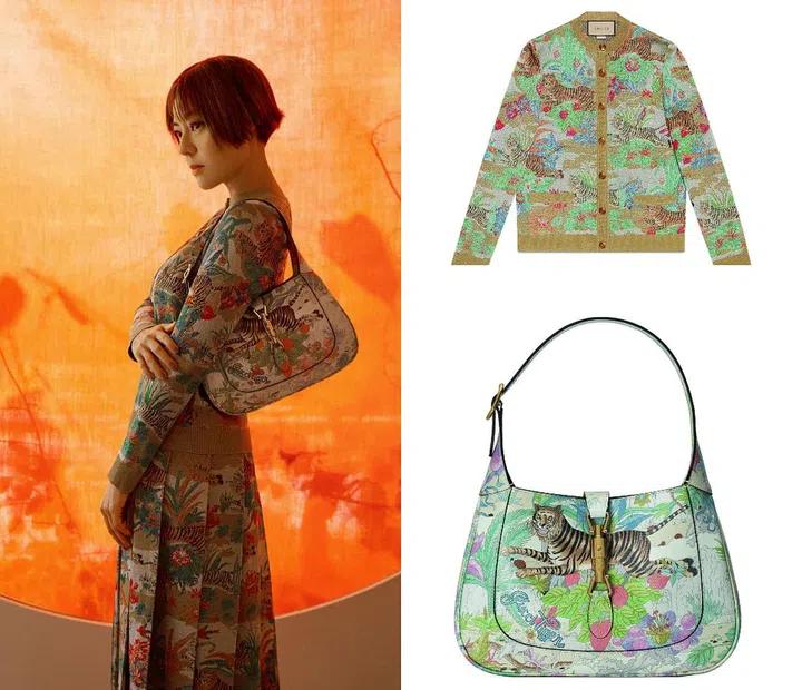 几位生肖属虎的本地艺人也为Gucci Tiger春节限定系列拍摄时尚大片,其中林慧玲(Rebecca Lim)身着Gucci 2022中国新年系列多色印花洋装,手提2022中国新年系列马衔扣1955系列印花肩背提包。
