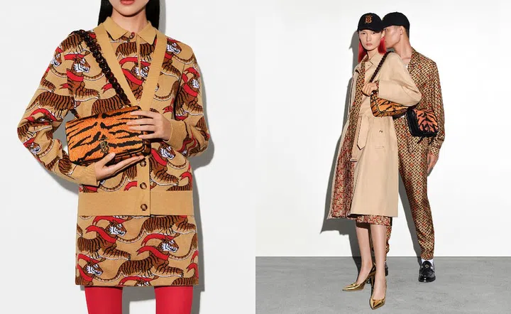 Burberry 2022新禧贺岁胶囊系列作品,以"生肖虎"为核心设计元素,歌颂虎年朝气蓬勃、自信坚毅的精神。装饰富丽的老虎斑纹遍布于手袋和成衣之上,也有本系列打造的专属印花图案,以蜂蜜米色为主色调,配上亮橙色元素,十分有新年气氛。