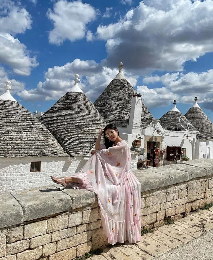 位于普利亚区附近的隐世小镇Alberobello,白墙灰瓦圆顶小屋宛如一朵朵可爱的蘑菇,充满童话氛围。蓝天白云加上“蘑菇屋”背景,陈雪铃身穿宽松舒适的连身长裙,花瓣蝴蝶印花点缀,温柔淡雅的粉色系,全身都洋溢柔美仙气。