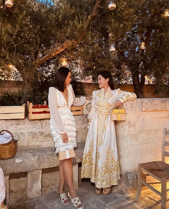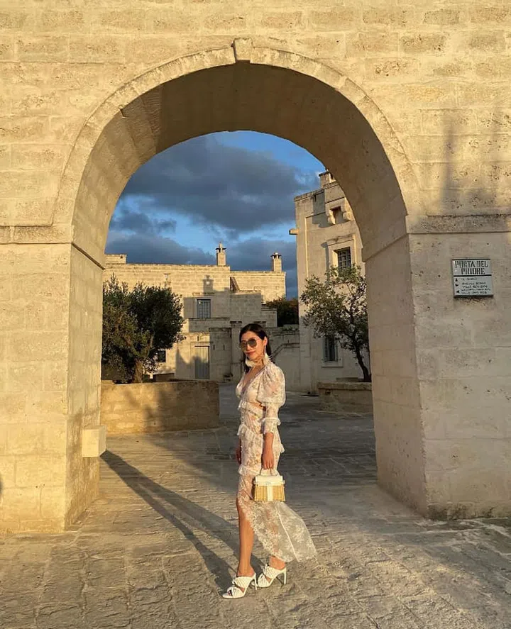意大利之行,她入住了顶级豪华別墅酒店Borgo Egnazia Hotel。坐落于普利亚区一幢传统建筑内,享有地中海植被的全景美景,酒店还设有一处美食活动广场中心。陈雪铃的晚餐look换上宫廷风的漂亮礼裙,繁复的金色刺绣设计尽显精致贵气。